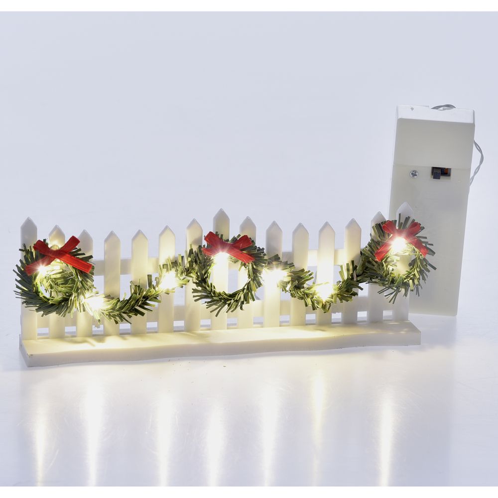 Πλαστικός φράχτης μινιατούρα με στεφάνια και λευκό φως μπαταρίας . Ιδανικό για την κατασκευή Χριστουγεννιάτικων χωριών και σκηνικών . Λειτουργεί με μπαταρίες ΑΑ που δεν περιέχονται.