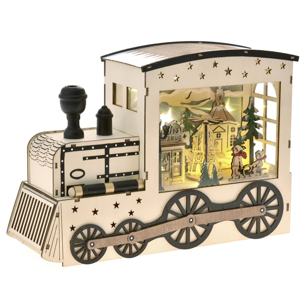 Φυσικό ξύλινο διακοσμητικό τρενάκι. Μουσική με κούρδισμα στο κάτω μέρος.Εχει και λευκό σταθερό φως. Λειτουργεί με μπαταρίες που δεν περιέχονται. Είναι διακοσμητικό , δεν κινείται , δεν είναι παιχνίδι.