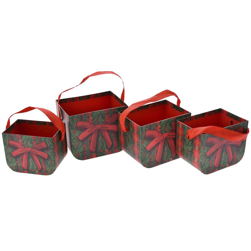 Χάρτινο Χριστουγεννιάτικο κουτί δώρων σε σχήμα τσάντας με κόκκινη κορδέλα χερούλι . Παραδοσιακό πράσινο και κόκκινο χρώμα με τύπωμα φιόγκο.Αποτελείται απο σετ/4 τεμαχίων στις εξης διαστάσεις 14χ11χ11 ,13χ10χ11 , 12χ9χ10 ,11χ8χ9 .