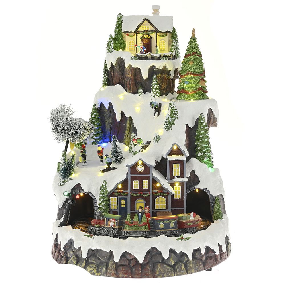 Χριστουγεννιάτικο εντυπωσιακό σκηνικό δένδρου με τρένο, σπιτάκια και σκιέρ. Το τρένο γυρνάει γύρω γύρω μέσα σε τούνελ, το δέντρο και τα ανθρωπάκια με το πατινάζ περιστρέφονται. Εχει φως σε αρκετά σημεία και μουσική με 9 τραγούδια. Η μουσική έχει κουμπί On/Off.